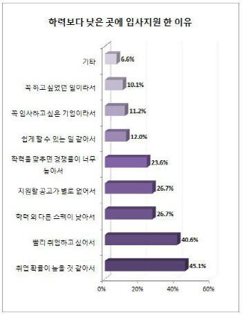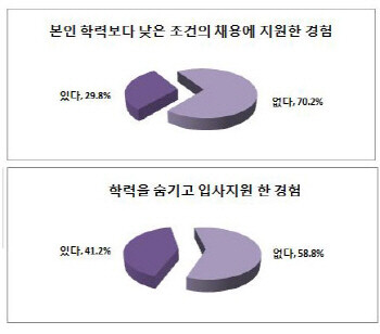 구직 활동 시 10명 중 3명은 학력을 낮춰 입사지원을 하거나 기업이 요구한 학력이 자신의 학력보다 낮은 곳에 입사지원한 것으로 나타났다.