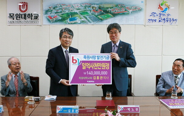 목원대학교회(담임목사 김홍관)가 24일 목원대학교(총장 박노권) 총장실을 찾아 대학발전을 위해 써달라며 1억4000만원을 기탁했다.