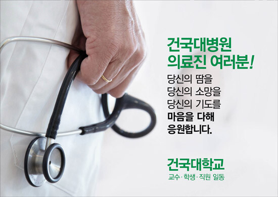 건국대 정문 등 출입구와 병원 곳곳에는 ‘건국대학교병원 의료진 교직원 힘내세요!’ ‘질병 퇴치를 위해 애쓰는 건국대학교병원을 응원합니다’ 등의 내용을 담은 현수막이 걸렸다. 또 의료진들을 응원하는 포스터를 제작해 페이스북 등 사회관계망서비스(SNS)를 통해 릴레이 응원을 펼치고 있다.