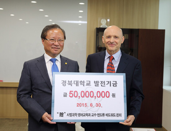 경북대 앤드류 핀치 교수는 30일 손동철 경북대 총장 직무대리를 방문해 대학 발전을 위해 써달라며 발전기금 5000만 원을 전달했다.