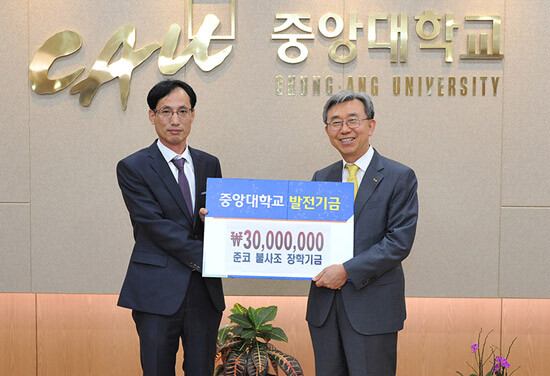 (주)준코 류경렬 대표는 지난 14일 오후 3시, 중앙대 총장실에서 ‘준코 불사조 장학금’ 전달식을 갖고 장학기금 3000만 원을 이용구 총장에게 전달했다.