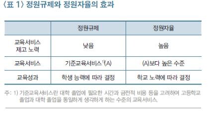 김 연구위원은 “대학들이 서로 경쟁해 더 많은 학생을 유치할 수 있다면 교육 서비스의 질을 높일 유인이 있으며, 교육성과도 이런 노력의 영향을 받을 것”이라며 “대학의 정원은 정부가 정책 수단으로 통제하기보다는 대학에 맡기는 것이 타당하다”고 말했다.