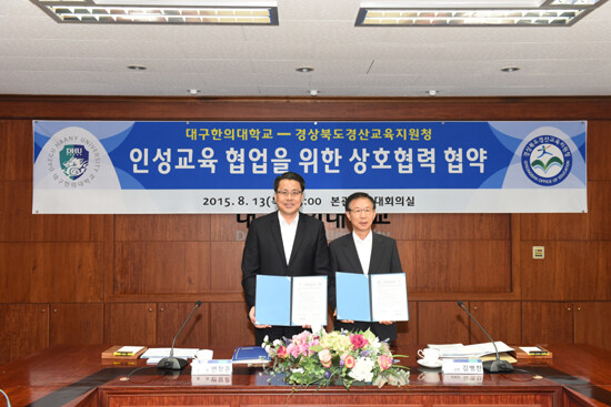 이번 협약은 지역사회 발전과 인성교육을 통한 행복한 학교 만들기에 동참하기 위해 마련됐다. 협약식에는 대구한의대 변창훈 총장, 김문섭 교학처장, 박동균 입학홍보부처장, 김종철 교양교육원 교수와 경산시교육지원청 김병찬 교육장, 노승학 교육지원과장, 김종윤 장학사, 최영희 장학사가 참석했다.