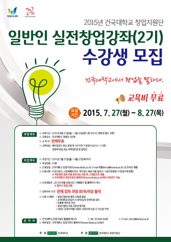 건국대학교(총장 송희영)는 창업지원단이 체계적인 창업 교육을 통한 지역 내 창업 활성화를 위해 오는 31일부터 9월 22일까지 '2015 일반인 실전창업강좌'를 운영키로 하고 오는 27일까지 일반인 참가자를 모집한다.