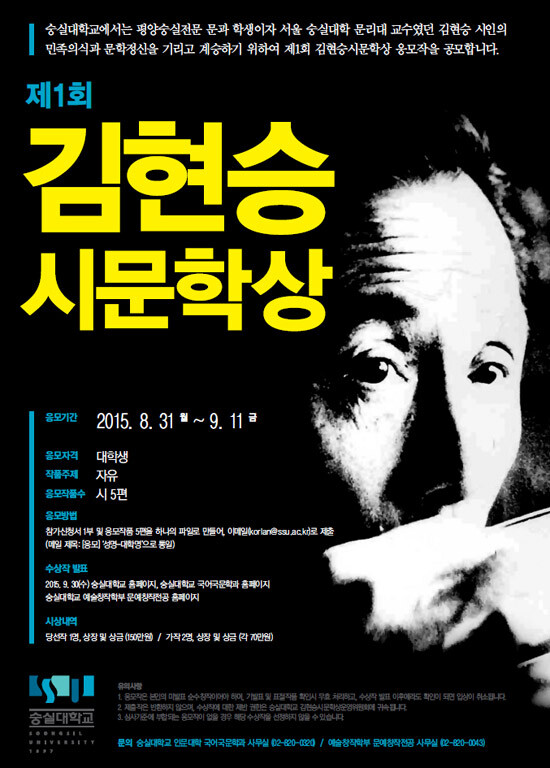 숭실대는 제1회 김현승 시문학상 공모전을 오는 31일부터 9월 11일까지 진행한다. 응모자격은 전국 대학생이며 시 5편을 자유주제로 창작해 제출하면 된다. 당선작품은 9월 말까지 심사를 통해 당선작 1명과 가작 2명을 선발할 예정이다. 각각 상금 150만 원, 70만 원을 수여받게 된다.
