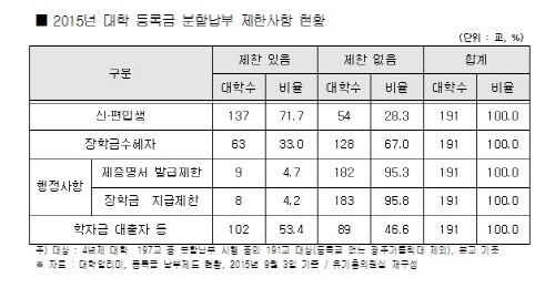 이같은 현상은 분할납부 신청자격에 제한을 두고 있는 대학이 많이 때문인 것으로 풀이된다. 191개 대학중 137개 대학은 신ㆍ편입생에게는 자격을 제한했으며 63개 대학은 장학금 수혜자의 신청을 거부했다.
