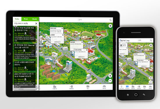 줌인은 PC나 모바일에서 zoomin.cu.ac.kr로 접속하면 이용 가능하다. 대구가톨릭대 효성캠퍼스 지도 위에 오늘 행사, 건물 찾기, 명소, 둘레길, 나의 위치 등이 표시된다. 특히 모바일로 이용 시 이동하면서 원하는 정보를 바로 확인할 수 있다. 구성원들에게 가장 유용한 서비스는 오늘 행사다. 행사명, 시간, 장소, 행사 성격 등을 바로 확인할 수 있고 지도 위에 행사장이 표시돼 찾아가기도 쉽다.