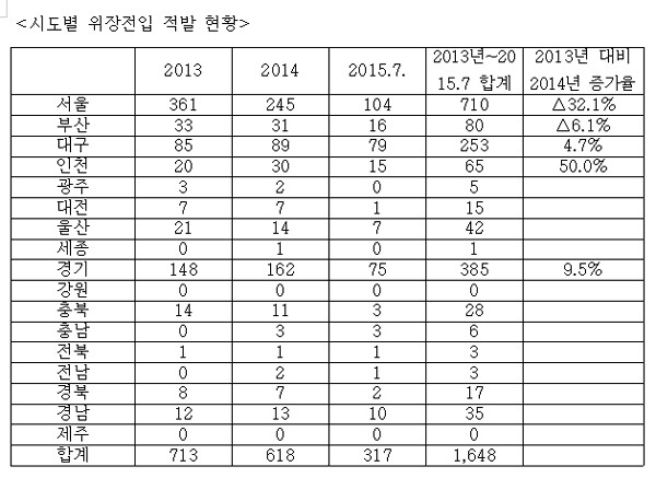 2013년부터 올해 7월까지 시·도별 위장전입 적발 건수는 서울이 710건(43.1%)으로 가장 많았다. 이는 서울에 일명 '강남 3구' 등 명문학군이 다수 포진된 결과로 풀이된다. 다음으로 경기 385건(23.4%), 대구 253건(15.4%), 부산 80건(4.9%), 인천 65건(3.9%), 울산 42건(2.5%) 등의 순이었다. 특히 2013년부터 올해 7월까지 수도권(서울·인천·경기)이 1160건으로 전체 위장전입 적발 건수의 70% 정도를 차지했다.