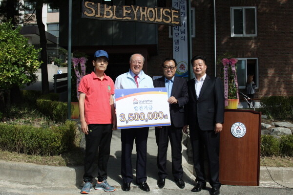 한남대학교(총장 김형태) 체육부 선수들의 학부모들이 15일 학교 측에 350만 원의 대학발전기금을 기탁했다. 발전기금 기탁식은 이날 교내 체육부 숙소인 ‘시빌리 기념관’ 리모델링 개관식과 함께 열렸다.