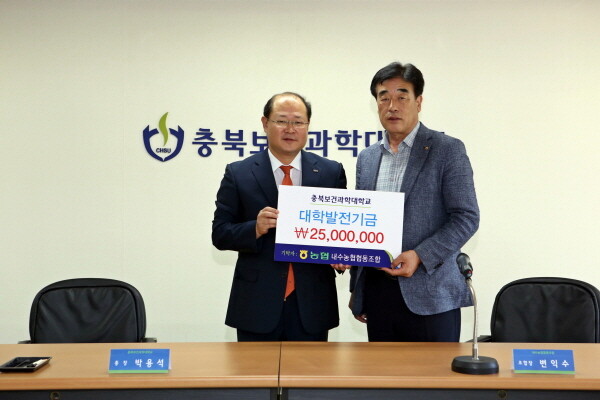 청주 내수농협(조합장 변익수)이 충북보건과학대학교(총장 박용석)에 발전기금 2500만 원을 기탁했다.
