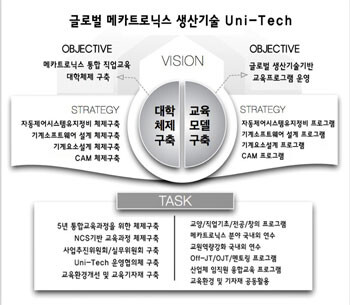 영남이공대의 사업단명칭은 ‘글로벌 메카트로닉스 생산기술 Uni-Tech 사업단’이다. 영남이공대는 창조경제 시대가 요구하는 전문기술인력은 ‘융합’에 강한 인재라고 여기고 전기와 기계기술에 모두 능통한 인재를 양성하겠다는 목표를 내세웠다. 이것이 곧 ‘메카트로닉스’형 인재다. 이와 같은 인재를 육성하기 위해 영남이공대가 내세운 직무는 자동제어시스템 유지정비, 기계소프트웨어 설계, 기계요소설계(CAD), CAM 등 4가지다. 협약기업들과의 협의를 통해 도출된 직무능력들이다.