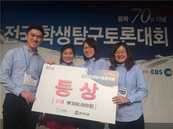 원광대학교(총장 김도종) 학생들로 구성된 ‘아웃브레인’ 팀이 한국교원단체총연합회와 교육부에서 진행한 ‘광복 70년 기념 전국 학생 탐구토론대회’에 출전해 동상을 수상했다.