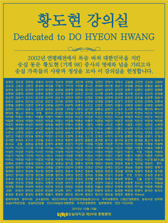 한편 故 황도현 중사는 1980년 2월생으로, 참수리 357호 병기사로 부임해 2002년 제2연평해전에서 22살의 나이에 전사한 숭실대 기계공학과 동문이다.