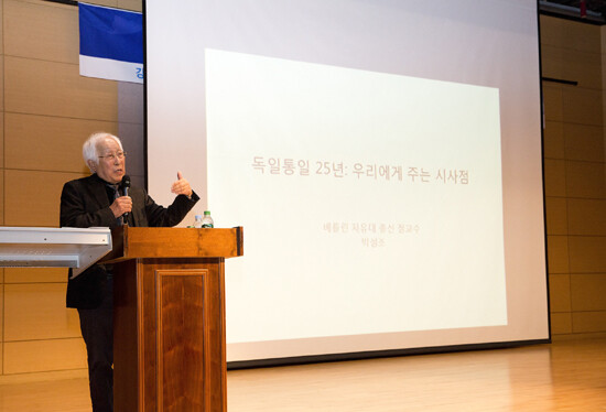 박성조 교수는 동양인 최초의 독일 대학 정교수다. 박 교수는 이날 '독일 통일 25년: 우리에게 주는 시사점'을 주제로 강연을 펼쳤다. 박 교수는 독일이 '민족'을 강조해 정치·경제통합을 위한 청사진을 제대로 만들지 못한 상태에서 통일을 진행했다고 설명했다. 이 때문에 통일 전보다 동독-서독 주민들 간 갈등이 심화됐다고 진단했다.