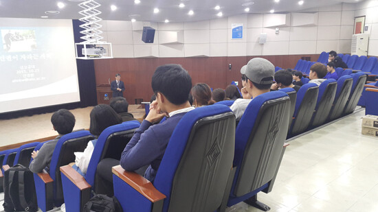 이번 특강은 금오공대 그린화학소재 창의인재양성사업단이 주최했다. 주제는 '인권이 자라는 사회'다. 졸업을 앞둔 4학년 학생들은 평소 공학도로 접하기 힘들었던 인권의 본질에 관한 개념을 이해하고 향후 사회인으로서 어떻게 인권을 실천할 것인지에 대해 고민하는 심도 있는 대화 시간을 가졌다.