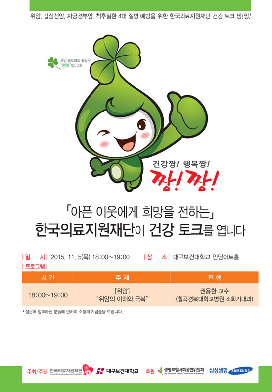 대구보건대학교(총장 남성희)는 오는 5일 대구보건대 인당아트홀에서 칠곡경북대학교병원 권용환 소화기내과 교수를 초청해'위암의 이해와 극복'이라는 주제로 건강상식강좌를 개최한다.