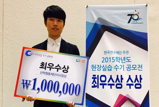 최우수상을 수상한 서명기 군은 2014학년도 하계 계절제 현장실습에 참여해 (주)대홍기획에서 4주간 근무(지도교수 진홍근)한 경험을 토대로 수기를 작성했다.