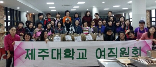제주대학교(총장 허향진) 여직원회가 지난 14일 제주대학교사범대학부설고등학교 급식실에서 김치 만들기 행사를 가졌다. 이날 만든 김치는 제주 아라동 독거노인 50세대에 전달했다.