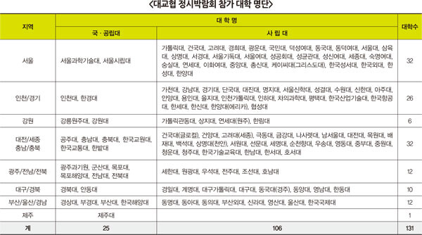 대교협 정시박람회 참가 대학을 구체적으로 살펴보면 서울권에서는 가톨릭대, 건국대, 고려대, 경희대, 광운대, 국민대, 덕성여대, 동국대, 동덕여대, 서울대, 삼육대, 상명대, 서경대, 서울과학기술대, 서울기독대, 서울시립대, 서울여대, 성공회대, 성균관대, 성신여대, 세종대, 숙명여대, 숭실대, 연세대, 이화여대, 중앙대, 총신대, 케이씨대(그리스도대), 한국성서대, 한국외대, 한성대, 한양대 등이 참가하고 인천·경기권에서는 가천대, 강남대, 경기대, 단국대, 대진대, 명지대, 서울신학대, 성결대, 수원대, 신한대, 아주대, 안양대, 용인대, 을지대, 인천가톨릭대, 인천대, 인하대, 차의과학대, 평택대, 한경대, 한국산업기술대, 한국항공대, 한세대, 한신대, 한양대(에리카), 협성대 등이 참가한다.