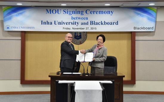 인하대 최순자 총장은 필립 머레이 블랙보드 아시아지역 부사장과 27일, 인하대 본관 제1회의실에서 블랙보드와 ‘Blackboard Learn+와 Collab 시스템 구축 및 MOOC 콘텐츠 제공을 위한 업무 협약’을 체결했다.