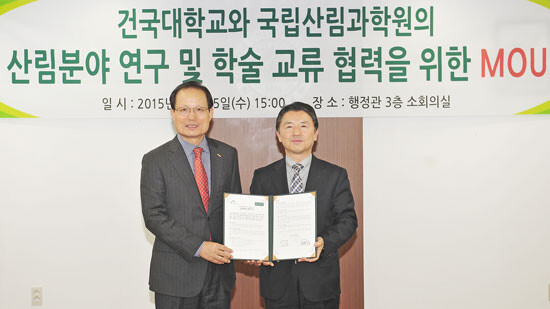 건국대학교(총장 송희영)와 국립산림과학원(원장 남성현)이 건국대 행정관에서 산림분야 연구와 학술 교류를 위한 상호협력 양해각서(MOU)를 체결했다.