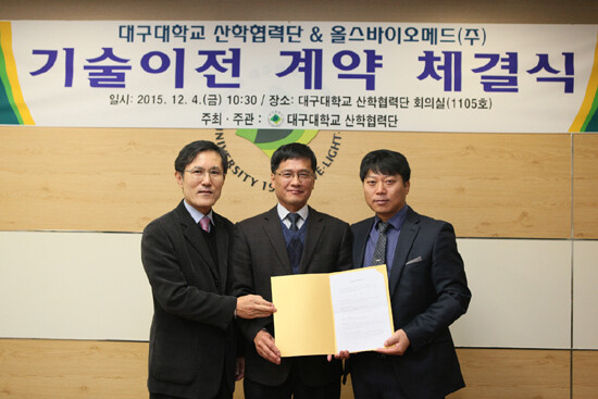 대구대학교(총장 홍덕률)와 올스바이오메드㈜(대표 최형배)가 지난 4일 대구대 경산캠퍼스 산학협력단 회의실에서 생명공학과 윤종원 교수 팀이 개발한 대장용종 및 대장암 동시진단 기술이전 계약을 체결했다.