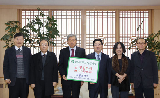 전남대학교(총장 지병문) 퇴임교수 모임인 '용봉오현회'가 11일 전남대 대학본부 5층 총장실에서 지병문 전남대 총장에게 대학발전기금 1000만 원을 전달했다.