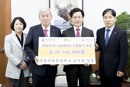 가톨릭관동대는 매년 '희망 나눔 캠페인'을 통해 연말마다 불우이웃 돕기 성금모금을 진행한다. 전 교직원의 사랑과 정성으로 올해에는 성금 1874만 6600원이 모였다. 이는 강릉시청에 전달됐다.