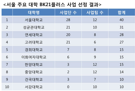 교육부 관계자는 "이번 중간평가는 국내 대학원의 질적 도약을 견인할 수 있도록 평가구조를 획기적으로 전환한 것이 특징"이라며 "다양한 강점을 지닌 사업단(팀)들은 향후 4년간의 지원을 통해 대학 교육·연구의 창의적 분위기를 제고하고 독창성 있는 성과를 창출할 것"이라고 말했다.