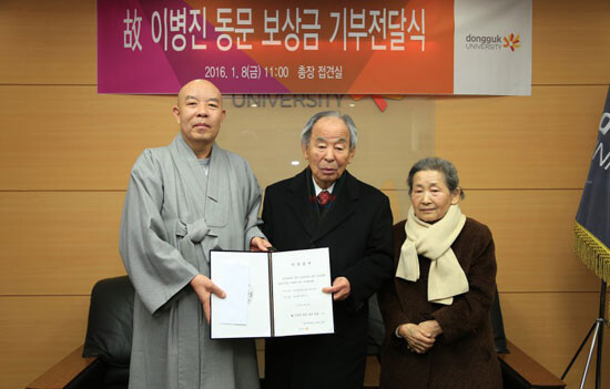 지난 8일 오후 1시, 故 이병진 씨의 형 이병윤 씨가 부인 김상남 씨와 함께 동국대를 찾아 한태식 동국대 총장에게 학교발전을 위해 써 달라며 6000만 원을 전달했다.