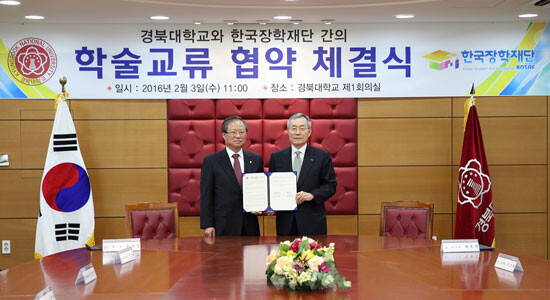 경북대학교(총장 직무대리 손동철)와 한국장학재단(이사장 곽병선)이 3일 경북대 본관 3층 제1회의실에서 학술 교류 등을 위한 협약을 체결했다.