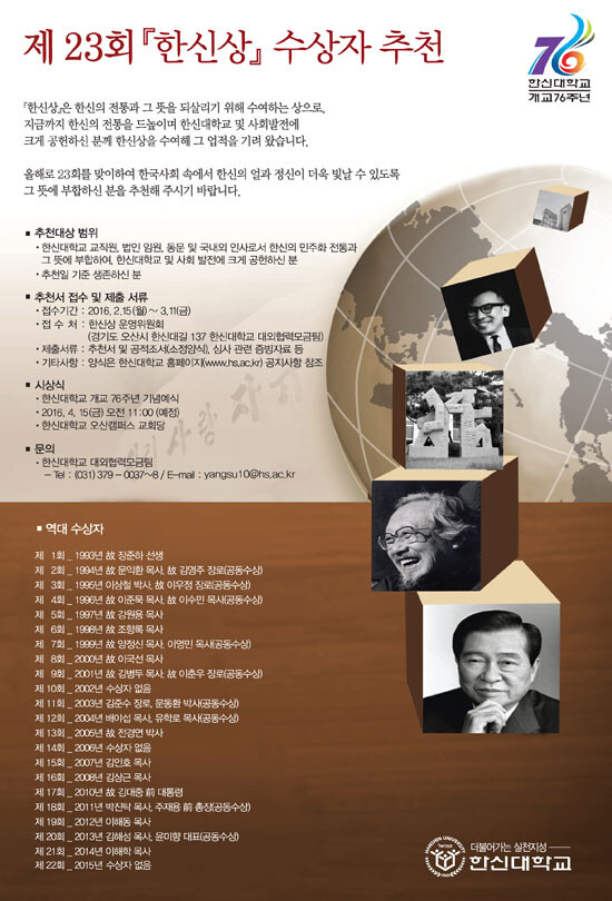 한신대학교가 15일부터 오는 3월 11일까지 제23회 '한신상' 수상자를 추천받는다.
