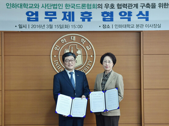 인하대 산학협력단은 지난 15일 인하대 본관 이사장실에서 (사)한국드론협회와 '드론 전문 인력 양성 및 공동사업 수행을 위한 양해각서(MOU)'를 체결했다.