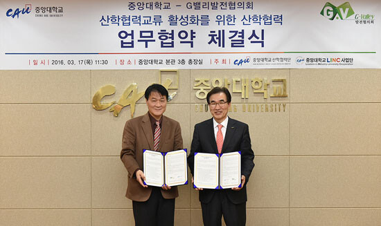 중앙대학교(총장 김창수)는 17일 흑석캠퍼스 본관 총장실에서 특성화 분야 기업지원 및 IT∙바이오 분야의 산학협력 활성화를 위해 G밸리발전협의회와 MOU를 체결했다.