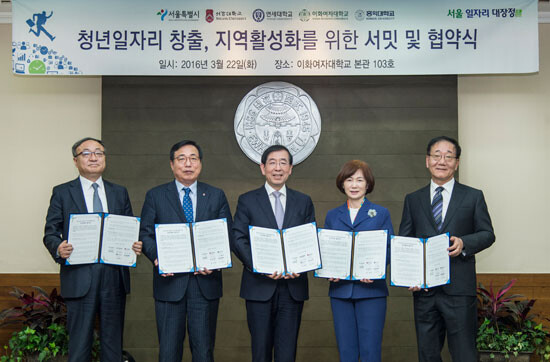 이어서 서울시와 4개 대학은 ‘청년일자리 창출 및 지역 활성화를 위한 공동협약(MOU)’을 체결했다. 협약을 통해 청년 취업난 해소 및 대학·청년 밀집지역인 신홍합(신촌-홍대-합정) 지역의 활성화를 위한 상호협력의 중요성을 인식하고 △청년일자리 창출 및 신홍합지역 발전을 위한 정책의 발굴·추진 △취업지원 프로그램 운영 및 맞춤형 교육 실시 △창업공간 제공, 창업교육 및 창업활동 지원 △창업 및 취업지원 서비스 시설과 프로그램 정보 공유 △신홍합지역 발전을 위한 정책 추진과정에 대학의 참여 지원 △지역사회와 대학 간 협력적 관계 구축에 공동 협력하기로 했다.