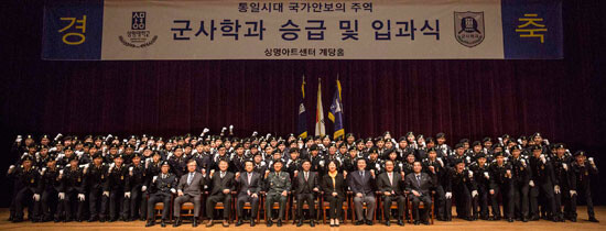 상명대학교(총장 구기헌) 군사학과는 23일 오후 3시 상명대 문화예술관 계당홀에서 승급 및 입과식을 개최했다. 이날 74명이 승급하고, 2016학년도 새내기로 입학한 41명이 입과했다. 상명대 군사학과는 육군과 협약(MOU)에 따라 재학 중 군 장학생 시험을 거쳐 4년간 전액 장학금을 지급받고 졸업과 동시에 전원이 장교로 임관한다.