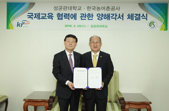 성균관대학교(총장 정규상)와 한국농어촌공사(사장 이상무)는 23일 성균관대에서 '국제교육교류협력에 관한 업무협약'을 체결하고 개발도상국의 농어업·농어촌개발 역량 교육에 협력하기로 했다.