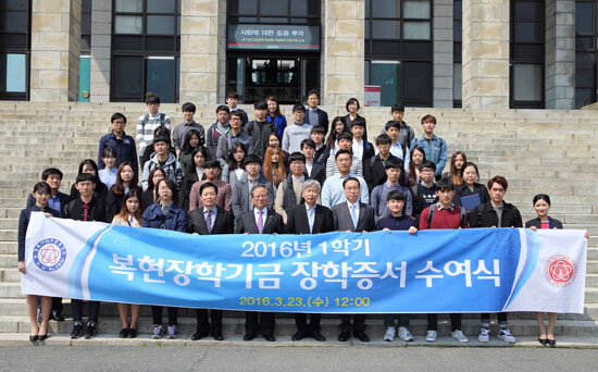 경북대학교(총장 직무대리 손동철)는 23일 경북대 본관 5층 중앙회의실에서 2016학년도 1학기 '복현장학기금 장학증서 수여식'을 가졌다.