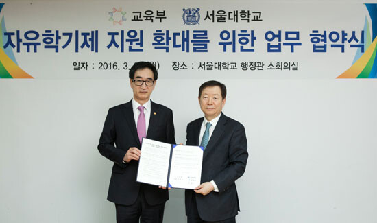 서울대학교(총장 성낙인)와 교육부(부총리 이준식)가 중학교 자유학기제 전면시행에 따른 진로체험 활성화를 위한 인적·물적 인프라 구축에 적극 동참한다.
