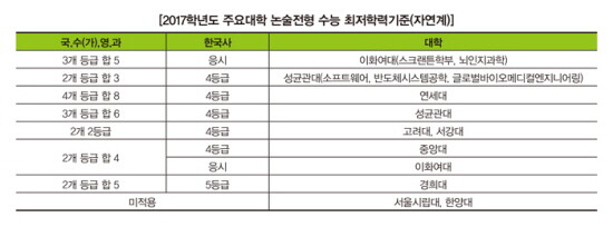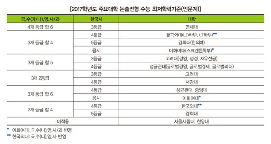 수능 최저학력기준은 논술전형의 매우 중요한 전형요소로 해마다 이를 충족하지 못하는 지원자가 다수 발생한다. 그러므로 자신의 수능 성적을 너무 낙관적으로 예상하지 말고 1~3학년의 누적된 모의고사 성적을 토대로 냉철하게 분석해 수능 최저학력기준 충족 가능성을 평가해야 한다. 특히 수능 최저학력기준을 적용하지 않는 대학인 서울시립대와 한양대에 지원하고자 하는 학생들은 자신의 논술 실력과 학생부를 객관적으로 파악해 합격 가능성을 예측 및 지원해야 한다.