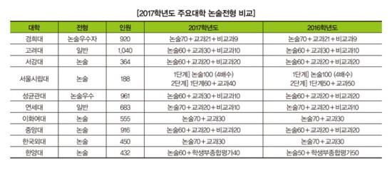 2017학년도 서울의 주요대학 논술전형 전형방법을 작년과 비교해 보면 서울시립대가 2단계에서 논술고사 비중을 10% 높이고 학생부 비중을 낮췄다. 성균관대는 논술고사의 비중을 60%로 유지하고 학생부 교과의 비중을 10% 높이고 학생부 비교과의 비중을 낮췄다. 한양대는 논술고사의 비중을 10% 증가시키고 학생부의 비중을 감소시켰다. 한양대의 학생부종합평가는 교과성적을 미반영하고 관련계열 교과 이수 여부만을 확인한다. 그리고 학생부에 기록돼 있는 출결, 수상경력, 봉사활동, 행동특성 및 종합의견 등을 참고해 학생의 학교생활 성실도를 중심으로 종합평가한다.