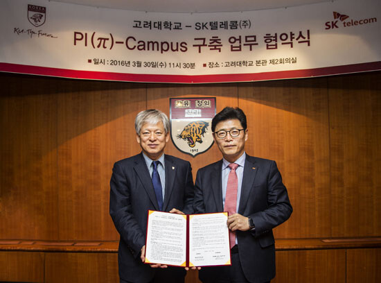 고려대와 SK텔레콤은 30일 고려대 본관에서 'PI(л,파이) 캠퍼스' 구축에 관한 MOU를 체결했다. 양 기관은 글로벌 기술 트렌드인 ICBM(IoT, Cloud, Big Data, Mobility)이 적용되어 있고 열린 ICT 생태계를 보유한 스마트캠퍼스를 구축한다는 데에 뜻을 모았다. PI(л,파이)-Campus는 고려대 슬로건인 '개척하는 지성(Pioneering Intellectuals)'과 Projection of IoTs on the Campus의 이중적인 의미의 합성어다.