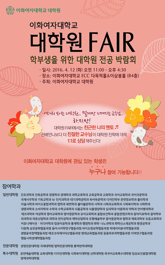 한편 2011학년도 1학기에 시작해 국내 대학원 페어 중 가장 오래된 역사를 자랑하는 이화여대의 ‘대학원 FAIR'는 외부 방문객을 포함해 연간 2500여 명이 참여할 정도로 매 학기 성황리 개최되는 행사다. 대학원 진학에 관심있는 학생이라면 별도의 사전 신청 절차 없이 누구나 참여할 수 있다.