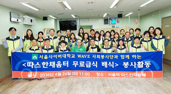이번 봉사는 (사)서울노숙인복지시설협회와 공동으로 진행했으며 서울사이버대 교직원과 학생 30여 명이 참여해 서울역 무료 급식소인 '따스한채움터'를 찾아 이웃사랑을 실천했다.