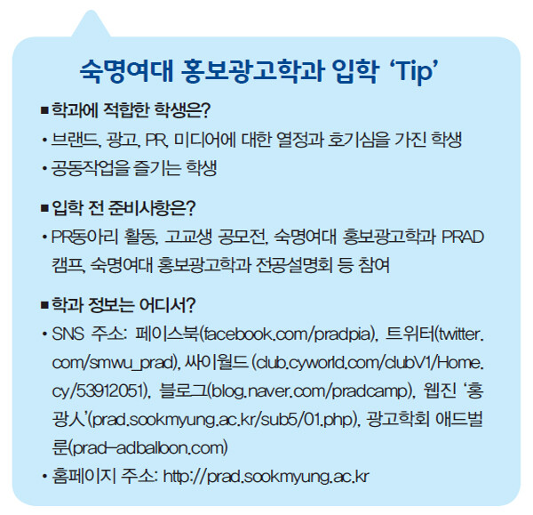 문장호 숙명여자대학교 홍보광고학과장은 “숙명여대 홍보광고학과는 홍보·광고 전공 분야뿐 아니라 창의력, 기획력, 커뮤니케이션능력이 필요한 직종의 인재상에 부합된 여성 전문인력을 양성한다”면