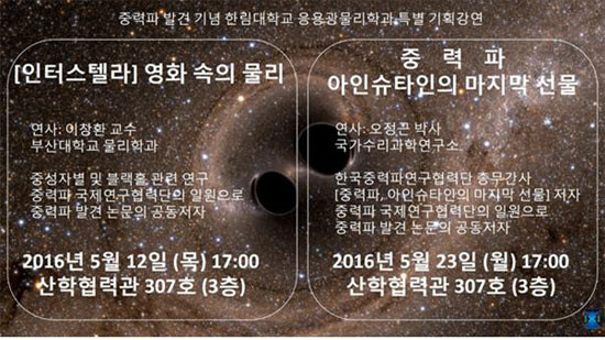 오는 12일 5시 한림대 산학협력관에서 열리는 첫 강연에서는 작년에 천만 이상의 관객을 동원한 영화 ‘인터스텔라’ 속에 담겨 있는 일반 상대성 이론을 이창환 교수(부산대 물리학과)가 알기 쉽게 강의할 예정이다.