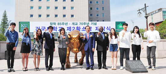 건국대학교(총장 송희영)는 올해 창학 85주년‧개교 70주년을 기념하기 위해 젊고 진취적인 모습의 ‘제2황소상’을 건립하고 12일 서울 광진구 건국대 새천년관 앞 공연광장에서 제막식을 개최했다.