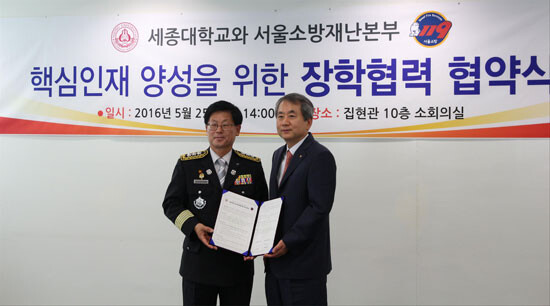 이번 협약은 서울시 소방재난본부 산하 소방기관의 소방공무원 및 의용소방대 자녀 중 세종대 재학생에 대해 학업 증진을 위한 학비 전액 또는 일부를 부담하는 장학 사업 추진이 목적이다.