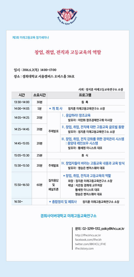 경희사이버대학교(총장 조인원) 미래고등교육연구소는 '창업, 취업, 전직과 고등교육의 역할'을 주제로 제3회 미래고등교육 정기세미나를 진행한다. 행사는 오는 6월 2일부터 경희대 서울캠퍼스 오비스홀 516호에서 열린다.