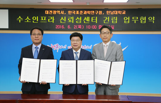 한남대는 2일 대전시청 중회의실에서 대전시, 한국표준과학연구원과 수소인프라 신뢰성센터 건립을 위한 업무협약을 체결했다. 협약식에는 이덕훈 한남대 총장과 권선택 대전시장, 박현민 한국표준과학연구원장 직무대행 등 주요 관계자가 참석했다.